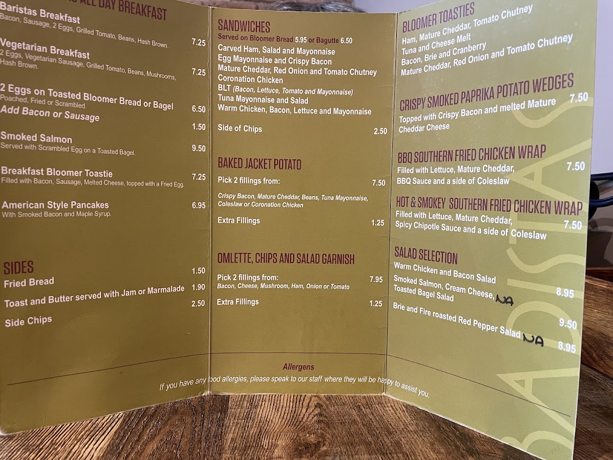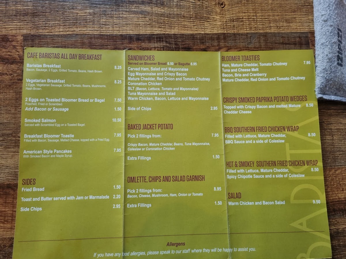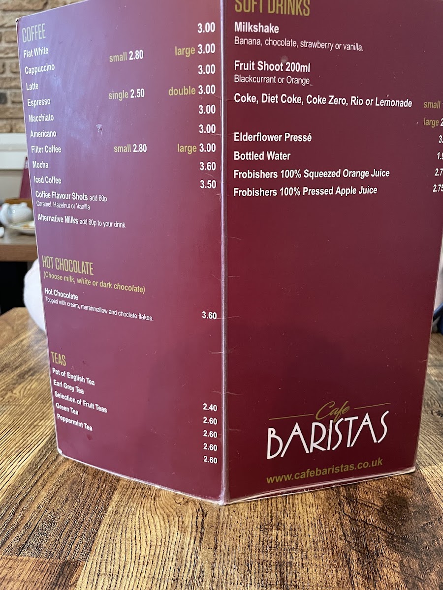 From the first bite to the last sip, the menu at Cafe Baristas Hook on London Road offers a well-rounded selection that caters to both traditional breakfast lovers and casual lunch-goers. Breakfast options like the hearty Baristas Breakfast and the plant-friendly Vegetarian Breakfast set a solid start to the day, while choices such as 2 Eggs On Toasted Bloomer Bread Or Bagel with Smoked Salmon or the indulgent Breakfast Bloomer Toastie provide variety for different tastes. Sides like Fried Bread and Toast And Butter Served With Jam Or Marmalade, alongside Side Chips, complement these morning dishes perfectly. For a lighter or more casual meal, the sandwiches range from classic Carved Ham, Salad And Mayonnaise and Egg Mayonnaise And Crispy Bacon to more flavorful options like Mature Cheddar, Red Onion And Tomato Chutney and Coronation Chicken, while the BLT offers a timeless favorite. The Bloomer Toasties are equally tempting, with standout combinations such as Tuna And Cheese Melt, Bacon, Brie And Cranberry, and Crispy Smoked Paprika Potato Wedges, alongside the spiced offerings of BBQ Southern Fried Chicken Wrap and Hot & Smokey Southern Fried Chicken Wrap. Beverage choices are equally comprehensive, from expertly brewed coffees like Flat White, Cappuccino, and Latte to Espresso and Macchiato, while non-coffee drinkers can enjoy a Milkshake, Coke, Coke Zero, Fruit Shoot 200ml, or refreshing Elderflower Pressé. For those seeking comfort or warmth, the Hot Chocolate and a selection of teas-including Pot Of English Tea, Earl Grey Tea, Green Tea, Peppermint Tea, and assorted Fruit Teas-round out the menu. Overall, Cafe Baristas Hook successfully balances classic staples with creative twists, ensuring every visitor finds something satisfying, whether for breakfast, lunch, or a leisurely drink.